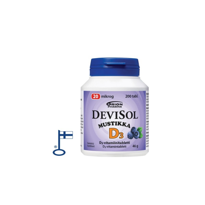 D-vitamin-sugtablett med smak av blåbär. Innehåller sötningsmedel. Den lilla och välsmakande tabletten löser sig snabbt i munnen och kan antingen sugas, tuggas eller sväljas. Devisol Mustikka innehåller vitamin D3 som absorberas väl.