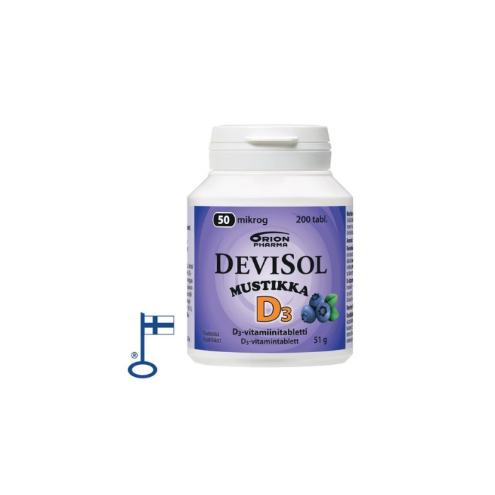 D-vitamin-sugtablett med smak av blåbär. Innehåller sötningsmedel. Den lilla och välsmakande tabletten löser sig snabbt i munnen och kan antingen sugas, tuggas eller sväljas. Devisol Mustikka innehåller vitamin D3 som absorberas väl.