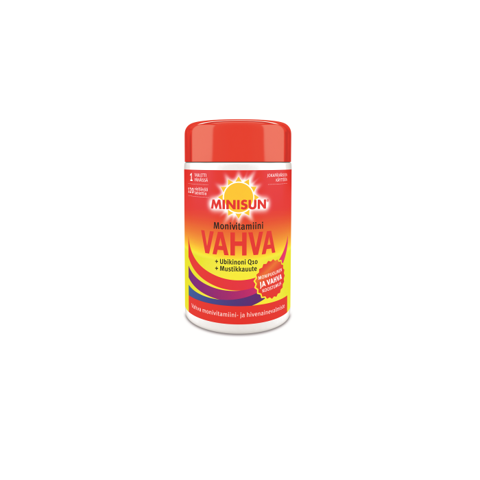 Minisun Multivitamin Stark är ett multivitaminpreparat särskilt framtaget för aktiva finländare. Innehåller en rejäl dos vitaminer som särskilt understödjer kroppens motståndskraft. En stark komposition som ger mer energi och ork varje dag. Innehåller bl.a. en ordentlig dos vitamin D, kalcium, vitamin B12, folsyra och zink. Dessutom ingår ubikinon Q10 och blåbärsextrakt. Minisun Multivitamin Stark lämpar sig särskilt för aktiva vuxna, sportare, personer som lider av stress och äldre personer. En sväljbar tablett om dagen räcker till. Produkten är fri från laktos, soja, gelatin, jäst och mjölk. Innehåller inga ingredienser ur glutenhaltigt spannmål.