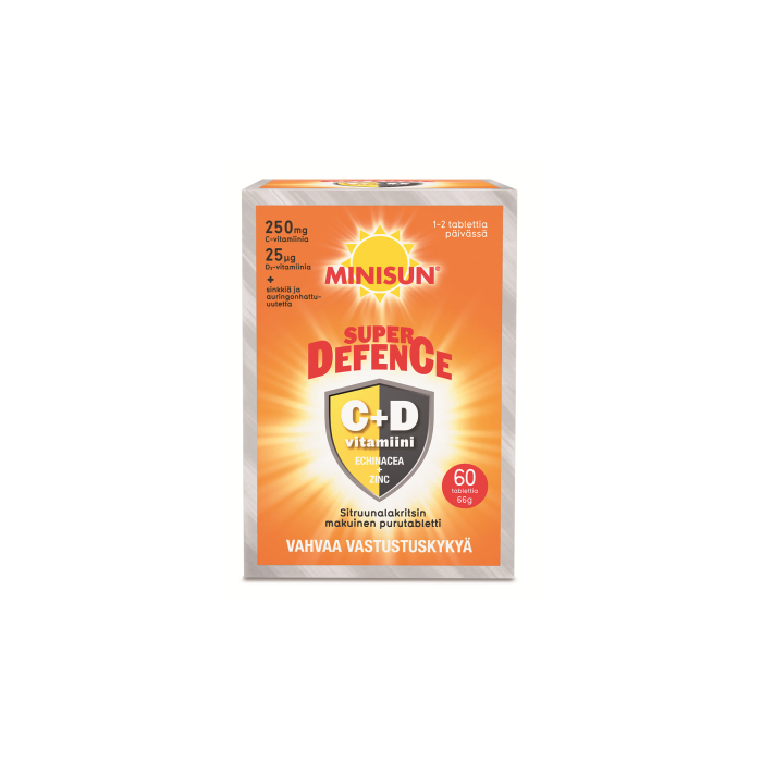 Minisun Super Defence är ett preparat med vitaminerna C och D3 samt zink och solhattsextrakt. Minisun Super Defence är ett riktigt superpaket för motståndskraften. Innehåller 250 milligram vitamin C och 25 mikrogram vitamin D3 samt zink och solhattsextrakt. Bägge vitaminerna har i studier visats upprätthålla kroppens motståndskraft, och zink samt solhattsextrakt bidrar till immunsystemets normala funktion. Vitamin C har dessutom konstaterats minska trötthet och utmattning. Vitamin D är viktigt för benstommen och upprätthållandet av musklerna. Minisun Super Defence lämpar sig som kurer då kroppen är i behov av extra stöd. Tuggtabletterna med en god smak av citron och lakrits lämpar sig särskilt för vuxna. Dygnsdosen är 1 - 2 tuggtabletter. Produkten är fri från mjölk, laktos, gluten, soja, jäst och gelatin.